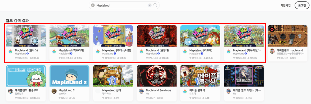 💡 참고: Mapleland 검색 시, 괄호 안에 빅토리아, 루더스/니할, 엘나스 등 여러 가지가 있는데 대륙 이름은 크게 상관 없습니다. 아무거나 선택해도 메이플월드가 실행됩니다.